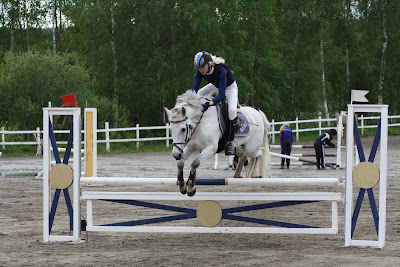 80cm: Samma mål här, komma runt men att ändå satsa på att få en placering. Tyvärr var pherrari så otroligt stressad innan jag skulle in(han stegrade sig och höll på) Jag k'ände redan då att halt skulle gå åt tjota hejti. Första hindret kom vi över men när vi kommit till hinder nr 2 hoppade han åt sidan och jag gjorde en volt och var jätte bsetämd, vi skulle över! Men denna gång blev det en tvärnit och jag tappade balansen, fastnade med foten i stigbyglen. Pherrari började att trav iväg och jag skyndade mig att lossa foten för att inte bli hängandes. Efter detta fick jag jaga pherrari ett varv inne på banan innan han blev infångad. Ush då var han inte mkt värd kan jag säga!;)