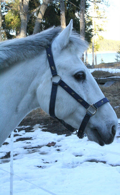 Men iallafall så red jag ut och familjen gick med på promenad. Nu när alla is är borta så är det en backe som är perfekt att gallopera upp i i full gallop! Så jag galloperade väl backen 5 gr och sedan travade jag honom på grusvägen en bra bit. Ställde honom vänster, höger osv som vi gjorde på Björne träning. Det behöver faktiskt inte vara så avancerad att göra en övning det går ibland lika bra att rida ett dresyr pass på en grusväg. Pherrari var JÄTTE SPEEDAD och vände med mig ett antal grr och då stod han flera minuter och bara studsade som en liten gummiboll. haha konstigt nog så tkr jag att det är kul när han gör så...sådan ryttare